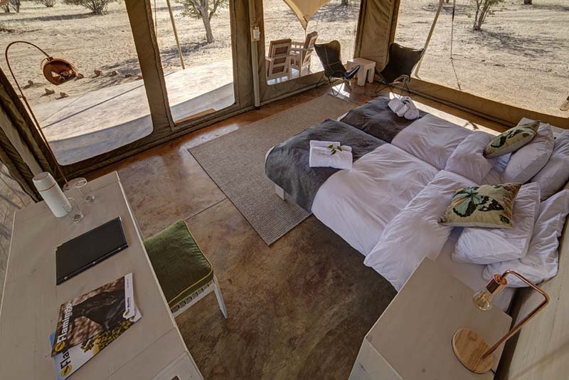 You will find Malansrus Tented Camp nestled between beautiful shady Mopane trees, with spectacular views onto a set of granite rocks close by.